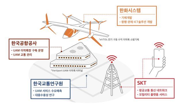 한편, 한국공항공사는 UAM 이착륙장(버티포트·Vertiport)의 구축·운영과 UAM 교통관리 분야를, 한화시스템은 UAM 기체 개발 및 항행·관제·ICT 솔루션 개발 등을 담당한다. 한국교통연구원은 UAM 서비스 수요예측 및 대중 수용성 등에 대한 연구를 맡는다.