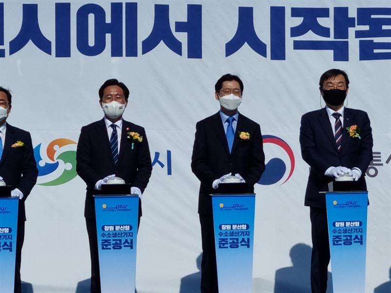한국가스안전공사 임해종 사장은 19일 경남 창원시가 주관한 “경남 수소생산부터 활용까지 행사”에 참석하고 관계자들을 격려하였다. (사진=수소생산기지 준공식.오른쪽 첫번째 임해종사장)