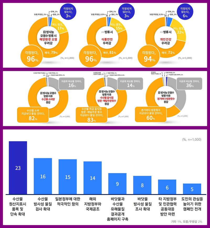 도민들은 일본에서 방사능 오염수를 예정대로 해양방류 시 문제점에 대해 '해양환경 오염(96%)', '식품안전(96%)', '개인건강(94%)' 등 선택지 모두 94% 이상 우려를 표했다.