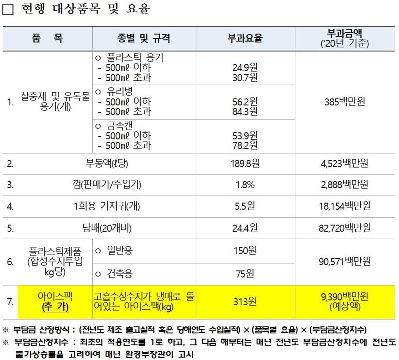 현재 폐기물부담금 부과대상 6종 품목에 '고흡수성수지가 냉매로 들어있는 아이스팩'이 새롭게 추가되며, 부과요율은 전체 중량 1kg당 313원으로, 300g 기준 개당 94원에 해당한다.