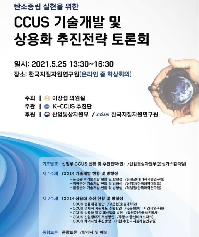 이장섭 의원은 “기후위기 대응을 위한 국제사회의 움직임이 빨라지면서 탄소중립과 온실가스감축이 환경을 넘어 경제적 이슈로 확장되고 있다”며, “탄소배출 제로를 위한 핵심 기술로 세계가 주목하는 CCUS 기술을 집중 육성하고 산업 생태계를 조성해 2050 탄소중립 달성을 뒷받침하겠다”고 강조했다.