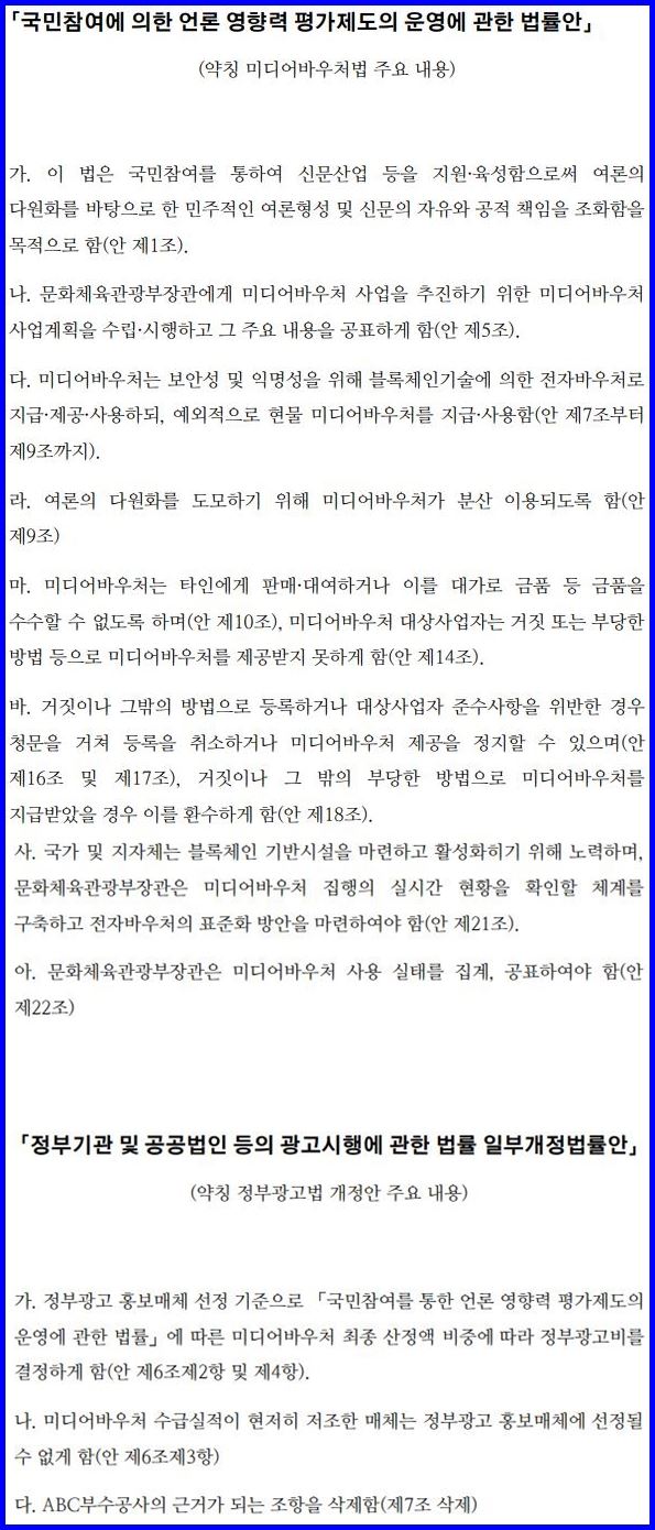 또한, “오늘 발의한 미디어바우처법은 신문, 인터넷신문, 뉴스통신, 정기간행물만을 대상으로 하고 있지만, 곧 방송매체를 비롯한 다른 미디어에도 확대 적용하겠다”라고 향후 계획을 밝혔다.