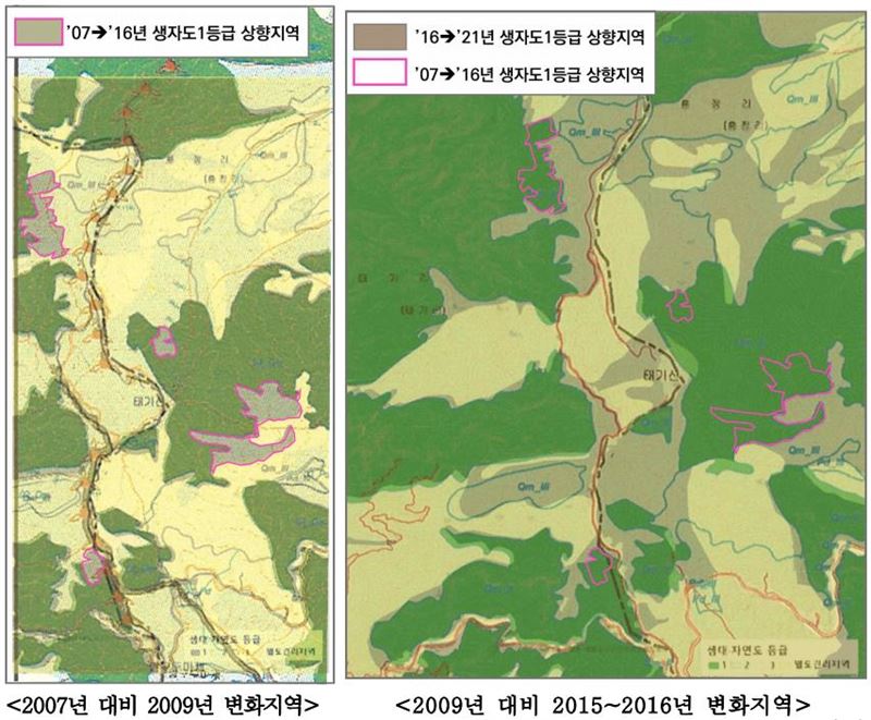 태기산 풍력발전단지는 40메가와트(MW; 2MW×20기) 규모로 2007년 공사 착공되어 2008년 11월에 운영, 현재까지 14년간 가동되고 있다. 이날 보고된 환경부와 한국환경정책·평가연구원(KEI)의 보고자료에 따르면 태기산 풍력단 지 주변의 생태자연도는 2등급에서 1등급으로 상향된 것을 확인할 수 있다.