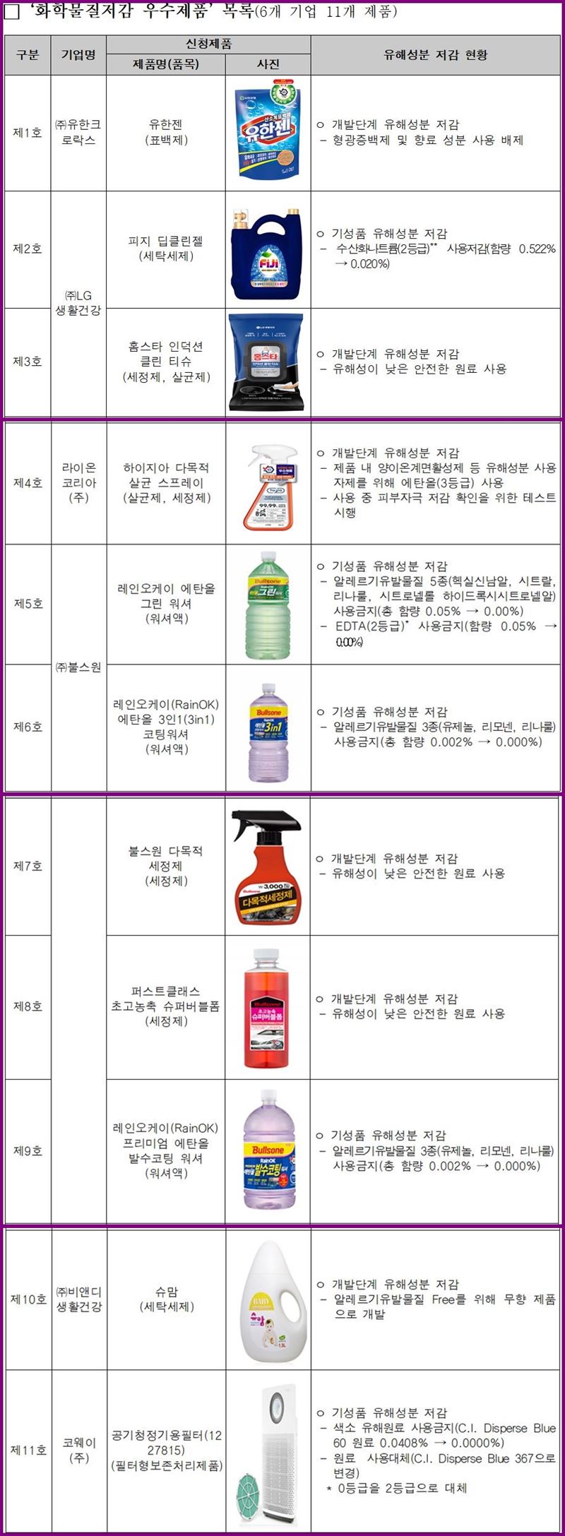 11개 우수제품은 ▲유한젠(표백제) ▲피지 딥클린젤(세탁세제) ▲홈스타 인덕션 클린티슈(세정제) ▲하이지아 다목적 살균 스프레이(살균제) ▲레인오케이 에탄올 그린 워셔(워셔액) ▲레인오케이 에탄올 3인1 코팅워셔(워셔액) ▲불스원 다목적 세정제(세정제) ▲퍼스트클래스 초고농축 슈퍼버블폼(세정제) ▲레인오케이 프리미엄 에탄올 발수코팅 워셔(워셔액) ▲슈맘(세탁세제) ▲공기청정기용필터(1227815·필터형보존처리제품)다.
