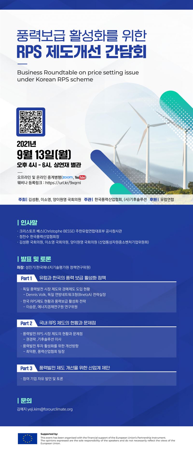 한국풍력산업협회와 기후솔루션은 9월 13일 오후 4시부터 '풍력보급 활성화를 위한 RPS 제도개선 간담회'를 온라인으로 개최한다. 이날 간담회에는 국내 풍력 보급 현황과 정책에 대해 알아보고 보급 활성화를 위해 업계가 필요로 하는 부분이 무엇인지에 대한 내용들이 논의될 예정이다.