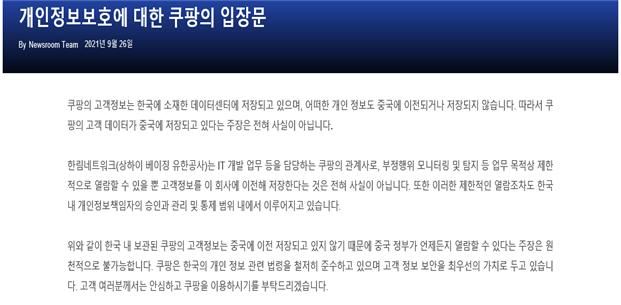 그러면서 쿠팡이 지난 26일 내놓은 해명에 대해 조목조목 반박했다. 쿠팡은 지난 26일 양정숙 의원이 쿠팡 회원들의 민감한 개인정보가 중국으로 유출될 가능성이 있다고 지적한 직후 즉각 입장문을 통해 해명에 나섰다.