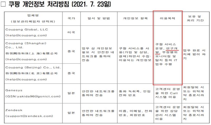 이렇게 수집한 중요한 정보를 중국에 있는 쿠팡 자회사인 '한림네트워크(상해/베이징) 유한공사'라는 곳에 이전하여 보관, 관리하고 있다.