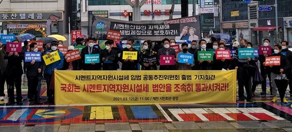 '지역자원시설세' 일명 시멘트세는 시멘트 생산 1톤당 1000원을 부과하는 법안이다. 시멘트업계 반발과 함께 수혜 지역인 제천·단양에서도 시멘트세 신설 대신 기금조성을 하자는 목소리도 나오고 있다. 이에 지난 12일 국회 행정안전위 법안심사소위원회는 지역자원시설세 심사를 보류했다.