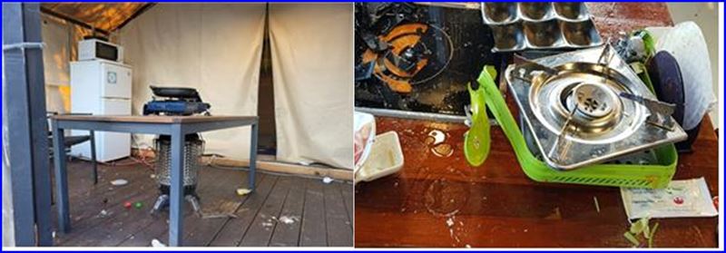 # 2021년01월06일 23:00경 경기도 소재 글램핑 텐트 내부에서 이동식부탄연소기를 사용하던 도중 테이블 아래에서 작동중인 가스난로의 영향으로 테이블 위에 있던 부탄캔의 내부압력이 상승하여 부탄캔이 폭발하여 2명이 부상 당했다.