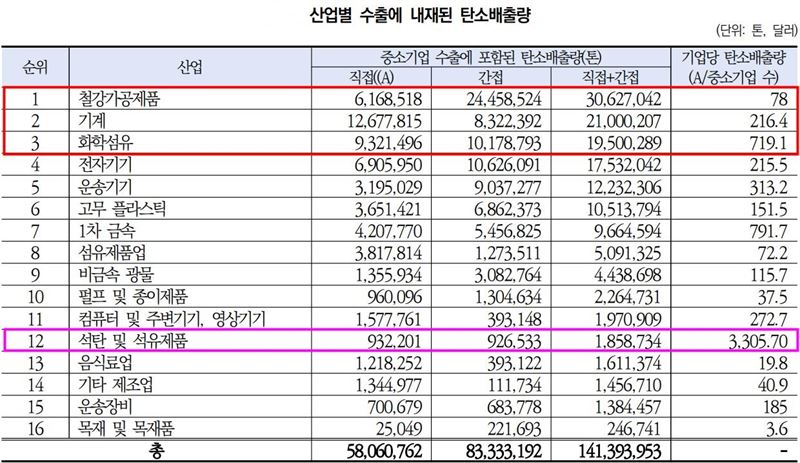 보고서에 따르면 우리나라 중소기업의 직접수출에 내재된 탄소배출량은 5,806만 톤, 간접수출에 내재된 탄소배출량은 8,333만 톤이며, 직·간접 수출을 모두 고려할 때 탄소비용 부담이 가장 큰 산업은 철강가공 산업이다.