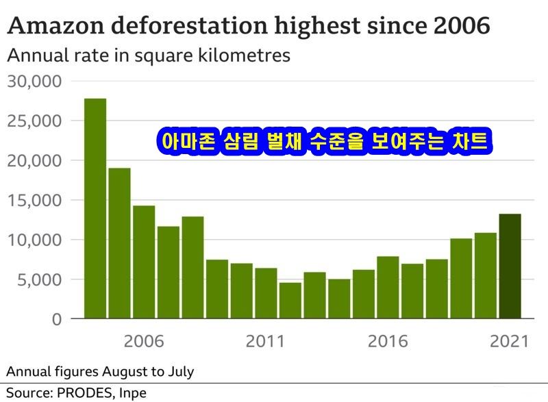 브라질 아마존 열대우림의 산림 벌채가 15년 만에 최대치를 기록한 것으로 나타났다. 브라질 국립 우주연구소의 보고서(INPE)에 따르면 삼림 벌채는 1년 만에 22% 증가했다. 브라질은 COP26 기후정상회의 때, 2030년까지 삼림 벌채를 끝내고 회복에 힘쓰겠다고 약속한 나라 가운데 한 곳이다. 아마존은 약 300만 종의 식물과 동물을 비롯해 원주민 100만 명이 사는 지역이다.