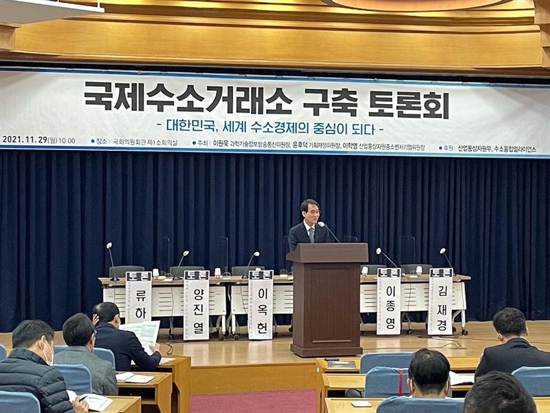 29일 국회 의원회관에서 열린 '국제수소거래소 구축 토론회-대한민국, 세계 수소경제의 중심이 되다'토론회에서 인사말을 통해 “석유국제거래소를 보유한 나라는 단순한 거래소를 넘어 오일허브로 부상하고 에너지 물류기능 확대 및 금융거래 서비스의 중심이 됐다”며 이같이 밝혔다.