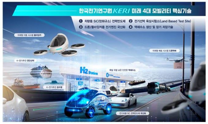 한국전기연구원(KERI, 원장 명성호)이 30일 세계 세 번째로 개발한 전기차용 탄화규소(SiC) 전력반도체 핵심 기술, 드론과 하늘을 나는 자동차(플라잉카)의 전기엔진 등 전기기술에 바탕을 둔 미래 모빌리티 4대 핵심 기술을 30일 공개했다.