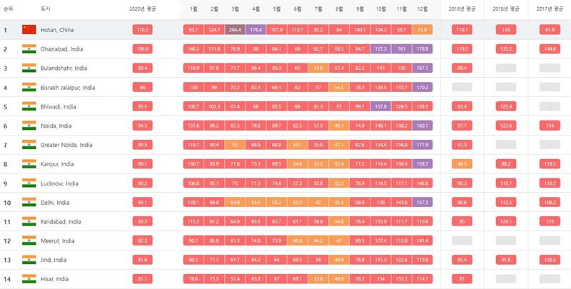 2020년 세계에서 가장 '오염된 100대 도시'는 모두 아시아 대륙에 분포되어 있는 것으로 나타났다.