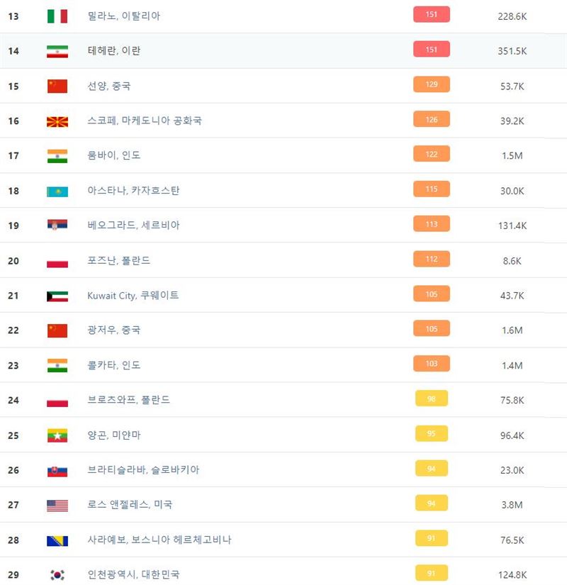 대기 질 추적기 IQAir의 최신 연례 보고서에 따르면 인도는 총 46개로 가장 많은 수의 오염된 도시로, 중국은 42개, 파키스탄 6개, 방글라데시 4개, 인도네시아 1개, 태국은 1개 도시가 포함 되었다.