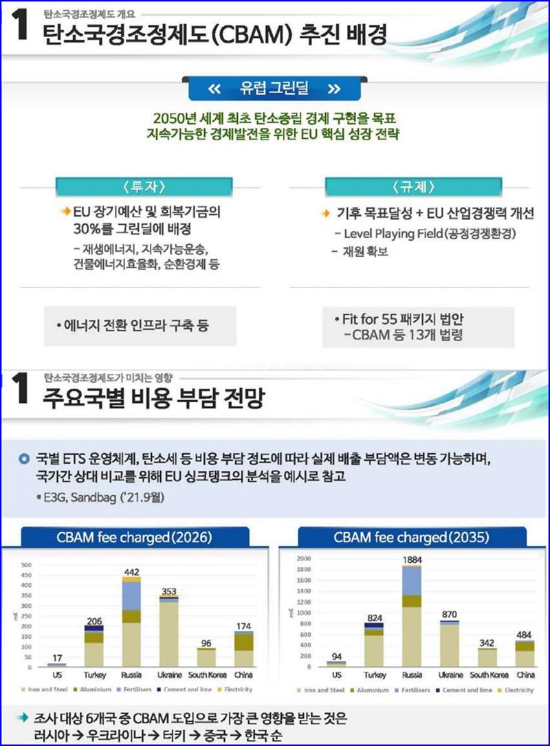 보고서는 탄소국경세가 2023년 도입되면 한국은 미국, EU, 중국 등 3국에 수출하는 철강, 석유, 전지, 자동차 등 주요 업종에서만 한 해 약 5억3000만 달러(약 6000억원)를 탄소국경세로 지불해야 할 것으로 추정했다. 규제가 강화되는 2030년에는 이보다 3배 이상 증가한 16억3000만 달러(약 1조8000억원)를 탄소국경세로 지불해야 한다고 분석했다.