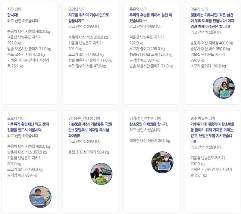 김성환 상임공동위원장은 “이재명 후보의 의지와 실행력에 국민 여러분의 참여와 작은 실천이 모이면 대한민국은 반드시 탄소중립 선도국가로 나아갈 수 있을 것”이라며, “'탄소중립 백만행동' 캠페인에 기후시민 여러분의 많은 관심과 참여를 바란다”고 말했다.
