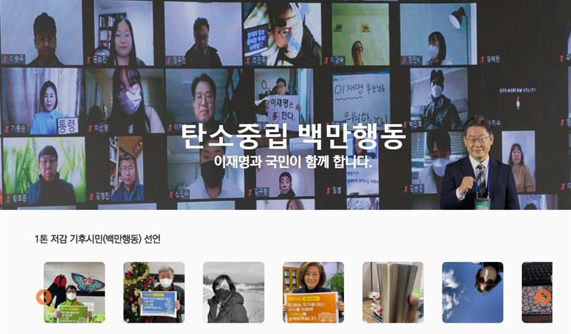 이재명 더불어민주당 대통령선거 후보가 전국민 탄소중립 실천문화를 확산시키기 위한 캠페인인 이재명과 함께하는 기후대선 캠페인 '100만 국민행동'을 시작한다. 이를 통해 다른 후보들과 차별화된 '이재명표 기후정책' 추진의지를 강력히 피력하고, 기후시민들과 플랫폼으로 소통하며 이번 대선에서 기후위기와 탄소중립 문제를 주요 쟁점화 해 대선 승리를 일구겠다는 계획이다.