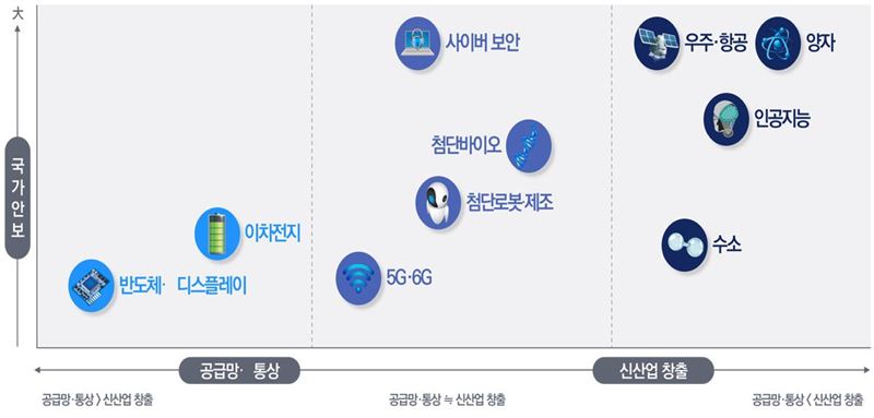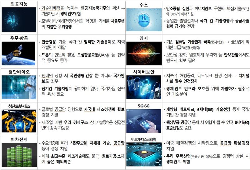 이번에 선정한 10개 분야는 ▲인공지능 ▲5G·6G ▲첨단바이오 ▲반도체·디스플레이 ▲이차전지 ▲수소 ▲첨단로봇·제조 ▲양자 ▲우주·항공 ▲사이버보안이다.