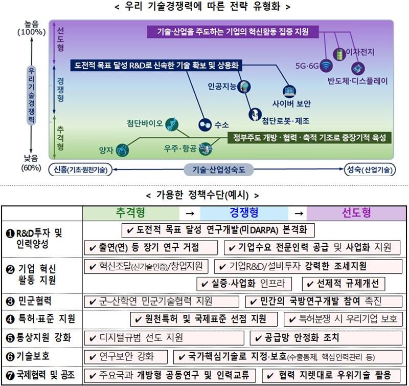 이에 따라 현재 최고 기술국 대비 60~90%에 머물고 있는 기술수준을 2030년까지 90% 이상 달성을 목표로 국가역량을 집중하는데, 필수전략기술별 특성을 고려한 맞춤형 전략방향을 토대로 기술의 확보부터 보호까지 종합적 육성·보호 전략을 추진한다.