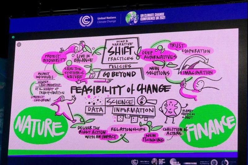 변혁적 리더십에 관한 COP26 세션, 토론이 진화함에 따라 주최측이 그린 마인드 맵.