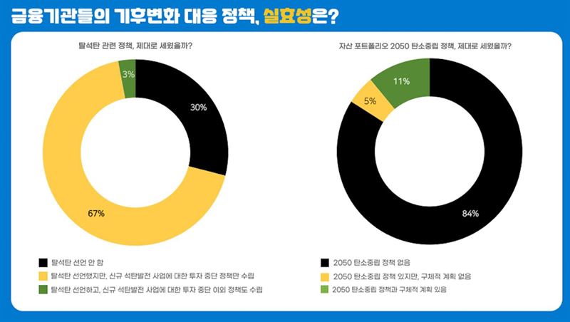 보고서에 따르면 주요 금융기관 100개 중 탈석탄 선언을 한 기관은 70개이고 이들 중 67개 기관은 '신규 석탄발전 사업에 대한 투자 중단' 정책만 수립했다. 국내는 물론 해외에서도 신규로 추진되는 석탄발전 사업이 전 세계 기후대응 기조에 따라 사실상 전무한 상황에서 실효성 있다고 평가할 수 없는 정책만 세웠다는 비판이다.