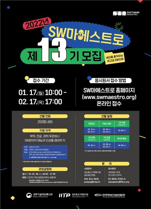 과학기술정보통신부와 정보통신기획평가원(IITP)은 2022년도 '제13기 소프트웨어 마에스트로' 과정에 참여할 연수생 250명 내외를 17일부터 2월 17일까지 모집한다고 14일 밝혔다.