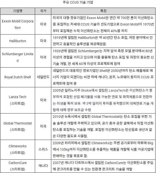 Kotra 해외시장자료에 따르면 '온실가스 배출량 제로(Net-zero emission)'를 국가 과제로 내걸고 있는 가운데, 국제에너지기구(IEA)는 2020년 9월 발간된 '에너지기술 전망' 보고서에서 CCUS 기술 없이는 온실가스 배출량 제로에 도달하는 것이 불가능하다고 전망했다.