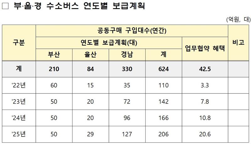 이번 협약 체결에 따라, 부·울·경은 2025년까지 지역 내 경유 및 압축천연가스(CNG)를 사용하는 버스 중에 624대를 수소버스로 전환하며, 환경부 구매 지원금(1대당 1.5억원)과 지자체 구매 지원금(1대당 1.5억원 내·외) 뿐만 아니라 제작사(현대차)에서 제공하는 추가 할인(101대부터 구매할 경우 1대당 300만원 이상)도 받을 수 있다.