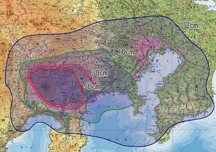 '후지산 해저드 맵' 의 상정에 의하면, 산정으로부터 70킬로 떨어진 후지사와시에서 최종적으로 30센치, 동 100킬로 떨어진 도쿄역에서 10센티가 화산재로 덮힐 것으로 예상된다. 피해 총액은 1.2조~2.5조엔으로 벼작 피해는 18만3000헥타르에 이를 것으로 예측했다.