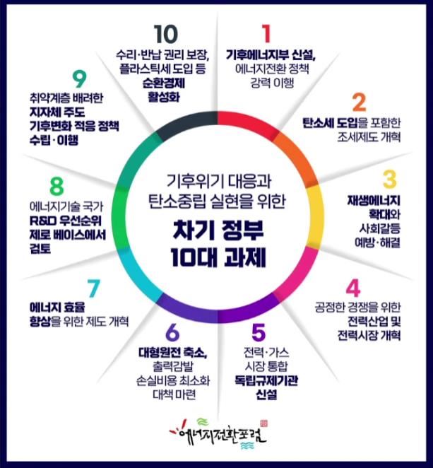 이날 에너지전환포럼이 제시한 10대 정책은 ▲기후에너지부 신설, 에너지전환 정책 강력 이행 ▲탄소세 도입을 포함한 조세제도 개혁 ▲재생에너지 확대와 사회갈등 예방·해결 ▲공정한 경쟁을 위한 전력산업 및 전력시장 개혁 ▲전력·가스 시장 통합 독립규제기관 신설 ▲대형원전 축소, 출력감발 손실비용 최소화 대책 마련 ▲에너지효율 향상을 위한 제도 개혁 ▲에너지기술 국가 R&D 우선순위 제로 베이스에서 검토 ▲취약계층 배려한 지자체 주도 기후변화 적응 정책 수립·이행 ▲수리·반납 권리 보장, 플라스틱세 도입 등이다.