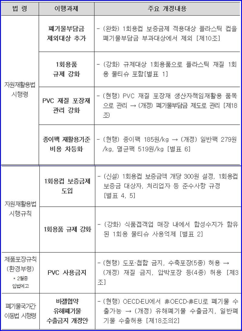이번에 공개된 하위법령 개정안은 폐기물의 감량과 순환성을 강화하기 위한 것으로, 1회용컵 보증금제 시행, 폴리염화비닐(PVC) 포장재 사용 제한, 1회용 물티슈 규제, 종이팩 재활용 확대가 주요 내용이다.