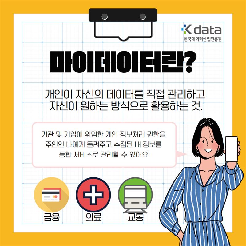소비자가 은행, 보험사, 카드사 등 금융 회사에 나의 신용 정보를 특정 마이데이터 업체에 제공해도 된다고 허락하면 업체는 개인의 은행 입출금 내용부터 대출 현황, 카드, 보험, 금융 투자, 통신 이용 기록, 부동산, 자동차 등 다양한 정보를 취합해 소비와 자산을 관리해주고 적합한 금융 상품도 소개하는 등 서비스를 제공하는 개념이다.