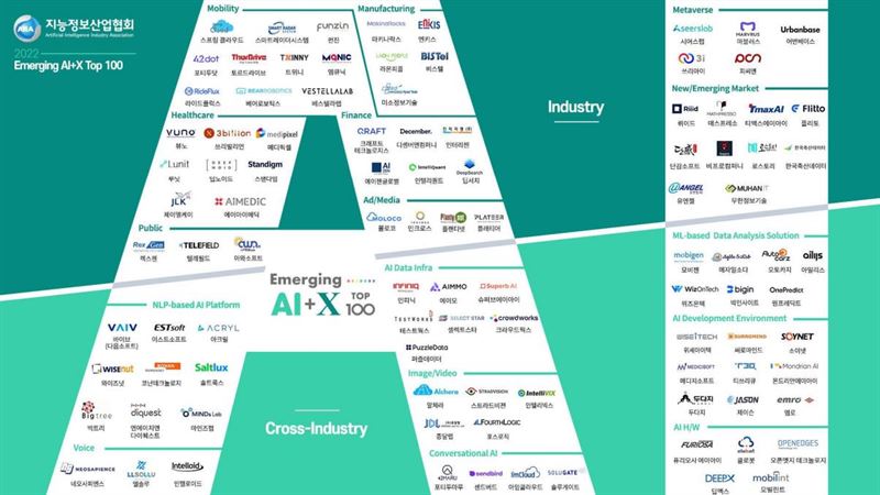'2022 AI+X Top 100'은 8개 산업(Industry) 분야와 8개 융합 산업(Cross-Industry) 분야로 구분, 선정했다. 8개 산업 분야는 제조업, 헬스케어, 모빌리티 등에서 특화 솔루션을 보유한 51개 기업이, 융합 산업 분야는 AI기술을 다양한 산업에 적용해 융합하고 있는 49개 기업이 각각 뽑혔다. 협회는 지난해에 이어 두번째로 'AI+X 톱 100'을 발표했다.