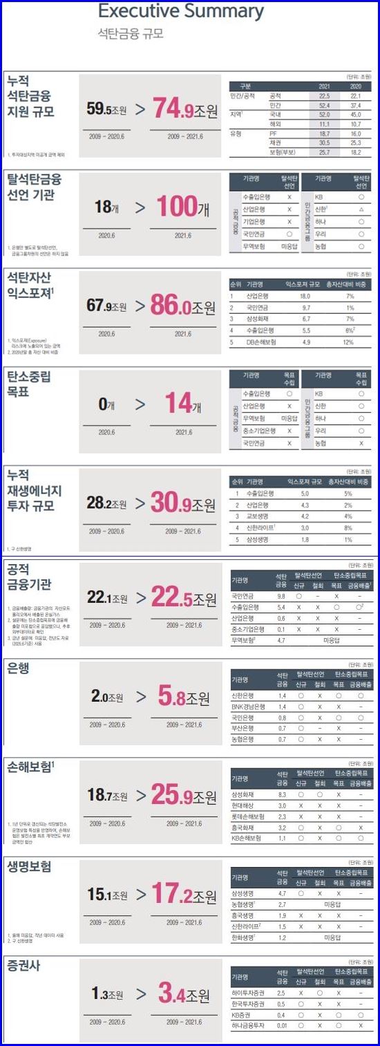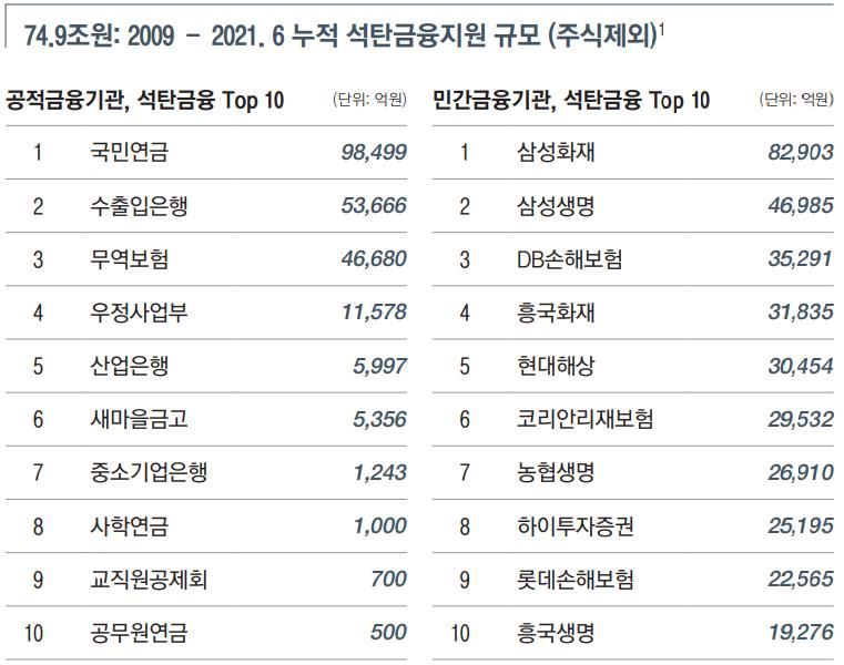백서에 따르면, 2020년 6월말 18개이던 탈석탄 선언 금융기관의 수는 1년만에 100개로 급증했다. 그럼에도 불구하고 우리나라 금융기관의 누적(2009년~2021년 6월말) 석탄금융 지원 규모는 약 74조9000억원으로, 지난 2020년 6월말 59조5000억원 대비 약 15조4000억원이 증가했다. 74조9000억원 중 39조9000억원은 공적금융, 46조원은 민간금융이었다.