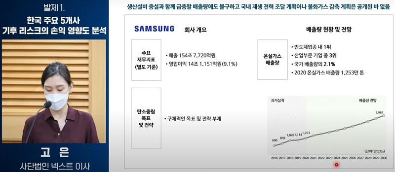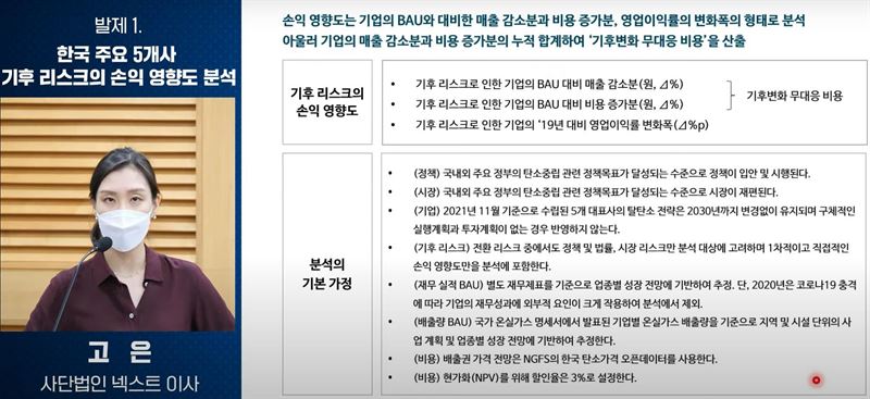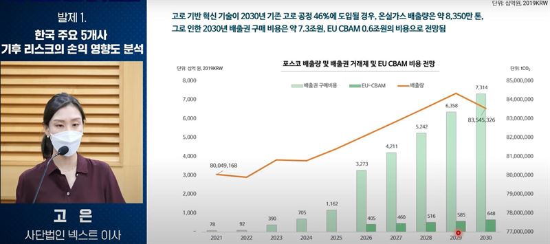 첫번째 발제에 나선 사단법인 넥스트 고은 이사는 배출권거래제의 강화, EU 탄소국경조정제도 등의 기후 리스크가 철강, 반도체, 정유, 석유화학, 자동차제조업의 대표기업 5개사에 어떤 영향을 미치는지 비용 및 손익 영향도를 제시했다.