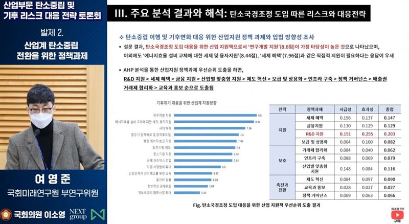 두번째 발제자인 국회미래연구원 여영준 부연구위원은 EU 탄소국경조정제도에 따른 산업별 파급효과를 전망했다.