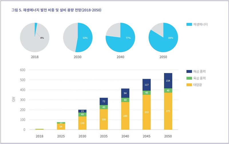 탄소중립 달성을 위해 이러한 전력 수요는 가능한 신속하게 재생에너지 발전으로 충당돼야 한다. 재생에너지 전력 비중은 2030년 53%, 2050년에는 84%까지 확대돼야 한다. 현재 37GW에 달하는 석탄화력 발전은 2035년까지 폐지돼야 하며 40GW의 용량을 차지하고 있는 천연가스 발전 또한 2045년까지 수소 터빈으로 교체돼야 한다. 원자력 발전은 정부 계획에 따라 2018년에는 22GW였던 발전 용량이 2030년에는 20GW, 2050년에는 11GW로 줄어 들 것이다.