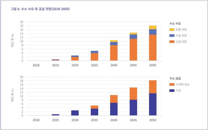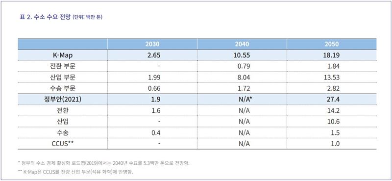 K-Map 시나리오에 따르면 2050년 기준 우리나라의 수소 수요는 1820만톤으로 산업 부문이 1350만톤을 차지하며 수송 부문 280만톤, 전환 부문 180만톤이 될 전망이다. 이는 정부안 의 수요 2740만톤보다 30% 이상 적은 수준인데 정부안에서는 전환 부문에서의 연료 전지 및 수소 터빈 활용에 큰 비중을 두었기 때문이다.