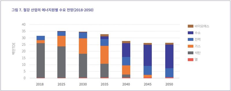 철강 부문에서의 탄소중립 달성에 있어서도 수소는 매우 중요한 역할을 담당한다. 기존 고로를 이용하는 제강 공정이 현재 철강 생산의 60% 이상을 차지하고 있는데 이를 2040년까 지 DRI 공법으로 전면 교체해야 한다. DRI 환원제로 우선은 천연가스를 사용하지만 수소가 원활하게 보급됨에 따라 점진적으로 수소를 환원제로 이용한다. 2050년에는 철강 부문에서의 에너지 소비 전체의 60% 이상을 그린 수소가 차지한다.