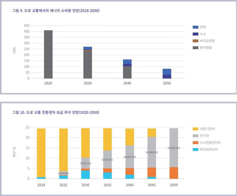 결과적으로 도로 교통에서의 에너지 소비는 지속적으로 감소한다. 친환경차량 보급에 비례해 화석 연료 소비가 줄어드는데 2020년 소비량 대비 2030년에는 171TWh(1470만TOE), 2050년에는 407TWh(3500만TOE)의 에너지를 줄일 수 있다. 이는 2030년에는 약 2900만톤, 2050년에는 약 7800만톤의 온실가스 감축으로 나타난다. 친환경차 보급을 통해 2050년까지 80%의 온실가스를 감축할 수 있다.