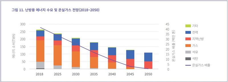 2025년부터는 신규 가스보일러 설치를 금지하고 히트 펌프(360만대)를 보급하고 지역난방을 확대하는 등 탈탄소 연료로의 점진적인 교체를 추진해야 한다. 이같이 감축 수단을 적용함에 따라 난방용 에너지 수요는 2018년 대비 2030년에는 55TWh, 2050년에는 155TWh가 줄어들고 온실가스는 2018년 대비 2030년에는 1700만톤, 2050년에는 4200만톤이 줄어 탄소중립을 달성할 것으로 전망된다.