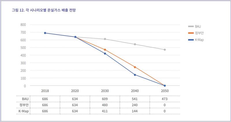 에너지 집약적인 산업의 비중이 높은 우리나라에서 화석 연료를 대체할 에너지원으로서 수소의 역할은 매우 중요하다. 그러나 K-Map 시나리오에서는 천연가스를 개질해 수소를 생산 하는 블루 수소는 전혀 고려하지 않는다.