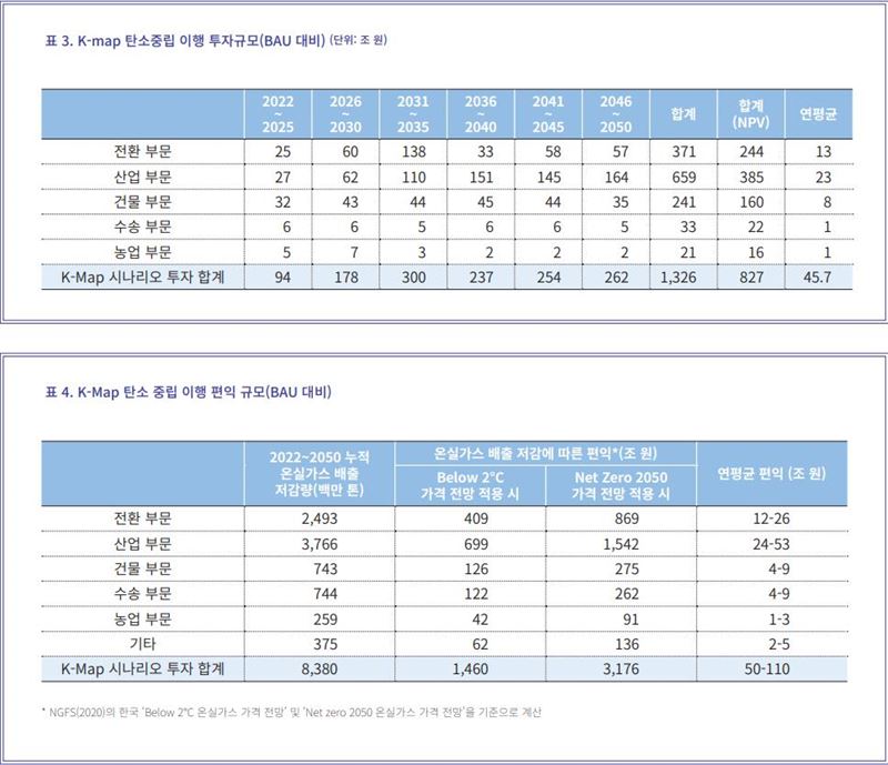 이러한 막대한 투자는 온실가스 배출에 따른 비용을 줄여 주는 경제적 효과로 돌아온다. K-Map 시나리오는 BAU 대비 약 83억톤의 온실가스를 감축할 수 있는데 이는 최소 ,400조원에서 최대 3100조원(연평균 50∼110조원)의 경제적 편익으로 돌아올 것이다. 여기에 더해 석유, 석탄, 천연가스 수입 저감에 따른 국부 유출 방지까지 포함할 경우 탄소중립 이행에 따른 편익은 엄청날 것이다.