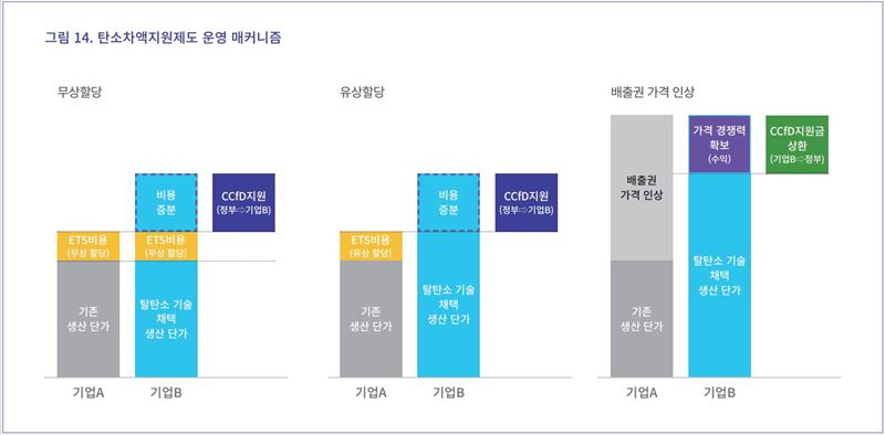 탄소차액지원제도는 새로운 저탄소 설비에 대한 투자 등으로 인해 생산 단가가 상승했을 때 그 상승분을 정부가 기업에 우선 지원하고 향후 온실가스 가격이 상승했을 때 배출권을 판매해 초과 수익이 발생하거나 온실가스 다배출 제품에 비해 생산 단가가 낮아져 수익이 발생했을 때 기업이 정부에 지원금을 환원하는 제도다. 기업이 생산 제품의 가격 경쟁력을 유지한 채 신규 설비 투자에 적극적으로 나 설 수 있도록 정부가 지원하는 제도라고 할 수 있다.