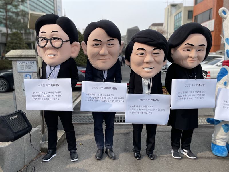 황인철 기후위기비상행동 집행위원장은 “전국 곳곳의 기후위기 현장에서 고군분투하고 있는 노동자, 농민, 주민들의 목소리가 지속가능하고 정의로운 사회로의 전환을 이룰 수 있는 힘”이라며 “대선은 기후위기 해결을 위한 비전이 논의되는 장이 되어야 하는데, 비전과 정책은 실종되고 선거 주인인 유권자의 목소리는 외면받고 있다”고 말했다.