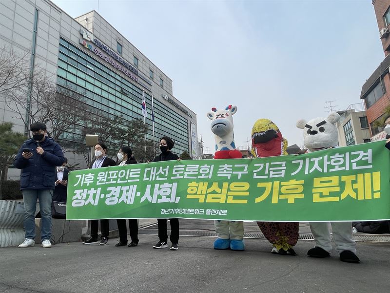 청년기후단체 회원들이 다음달 대선을 앞두고 기후위기만을 주제로 한 토론회를 개최해줄 것을 중앙선거방송토론위원회에 요구했다.