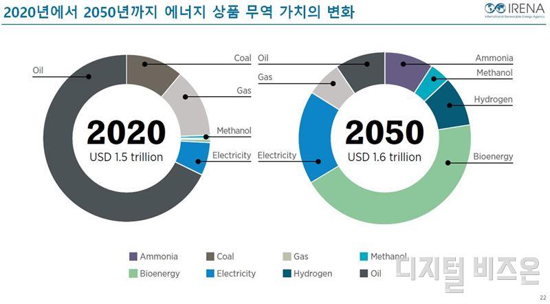 IRENA는 기후 시급성과 순 제로에 대한 국가의 약속에 힘입어 2050년까지 수소가 전 세계 에너지 사용의 최대 12%를 차지할 것으로 추정했다. 또한 20세기의 탄화수소 관계와 크게 다른 양자간 거래를 통해 경제 경쟁력을 높이고 외교 정책 환경에 영향을 미칠 가능성이 있다고 전망했다.