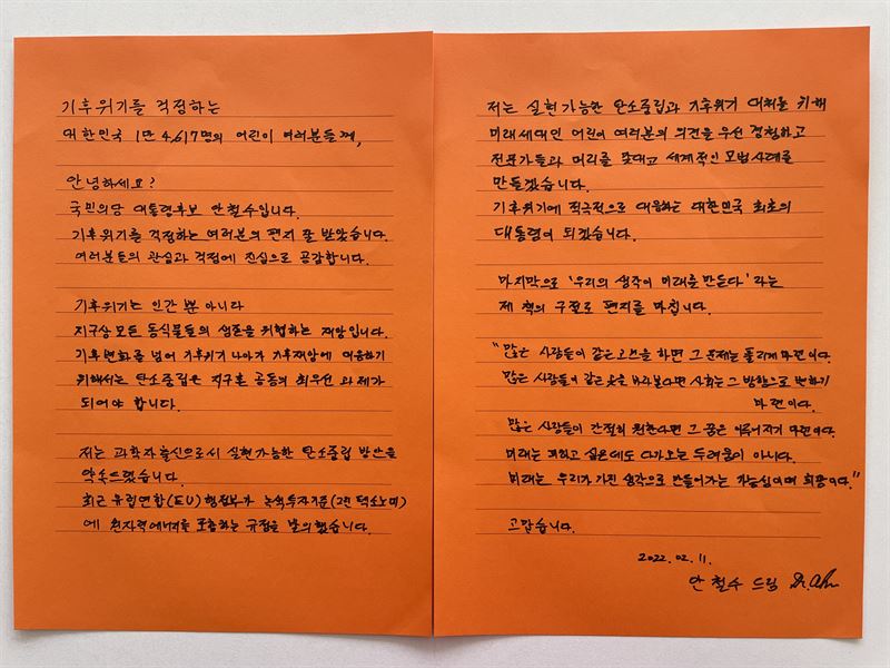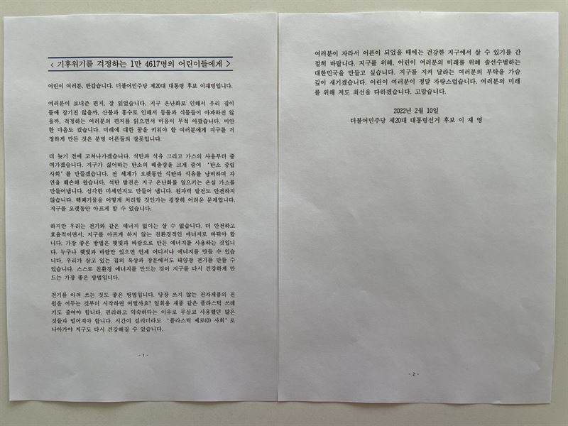 앞서 전국 594개 초등학교 1만4천6백17명 학생들은 대선 후보들에게 기후위기 대응을 요청하는 손편지를 썼고, 그린피스는 이 편지들을 모아 지난달 25일 주요 후보 캠프에 전달했다.