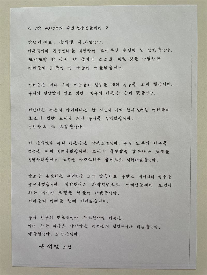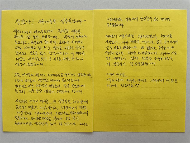 답장에서 후보 네 명은 한목소리로 적극적인 기후위기 대응을 약속했다. 안철수 후보와 심상정 후보는 직접 손글씨로 답장 편지를 썼다.